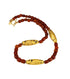 The Amber Glow Necklace is a captivating piece of jewelry featuring rare pecan-colored translucent amber beads discovered in an antique store. Enhanced with hand-gilded 23-karat gold leaf and a gilded gold lava stone, it radiates elegance and charm. The necklace measures 19 inches (48.26 centimeters) in length and is believed to attract good luck as the stone of courage.